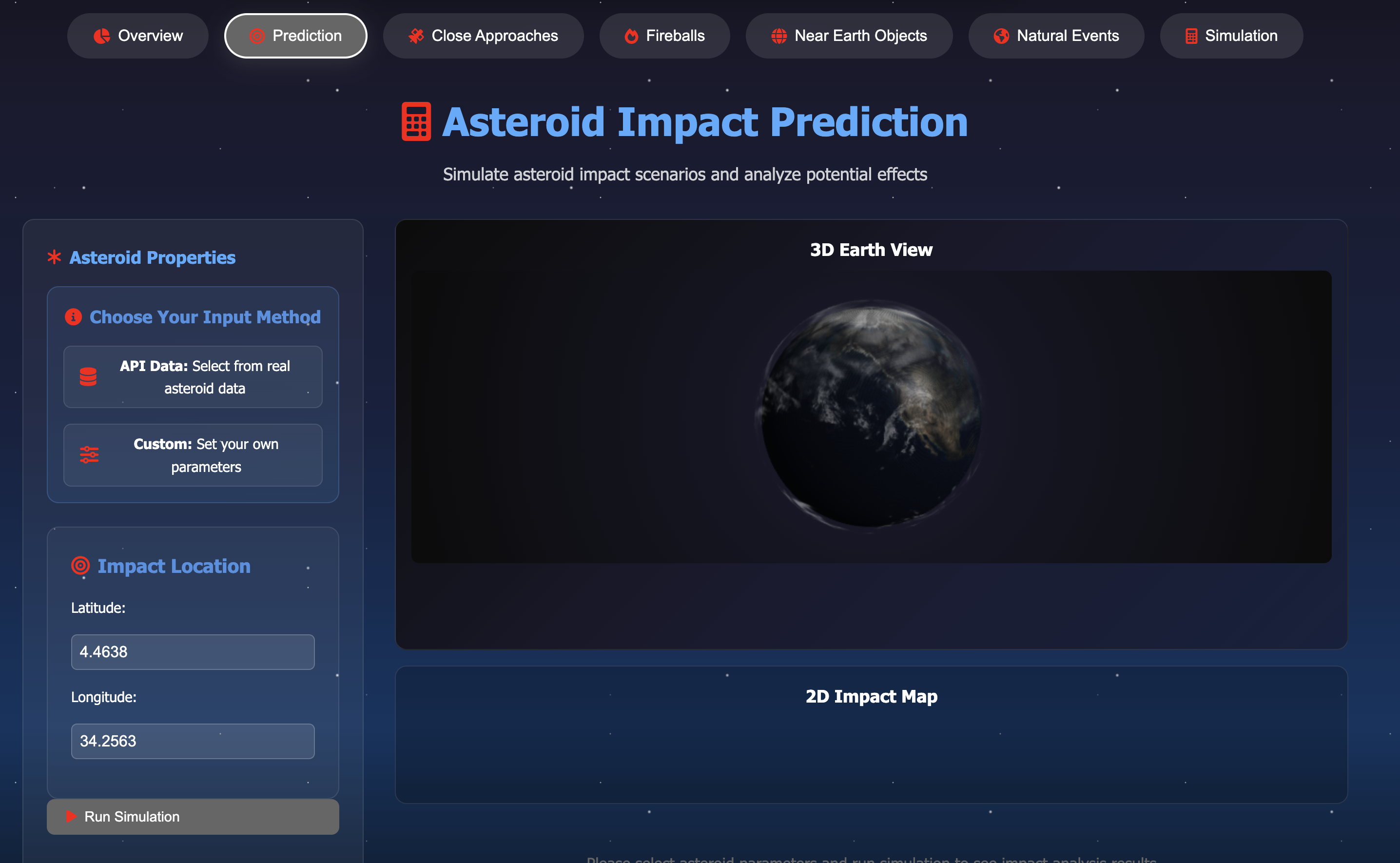 This project is a web-based interactive asteroid impact simulation and analysis platform that integrates NASA open data APIs to simulate potential near-Earth asteroid impact events and assess their physical, environmental, and potential socioeconomic impacts.